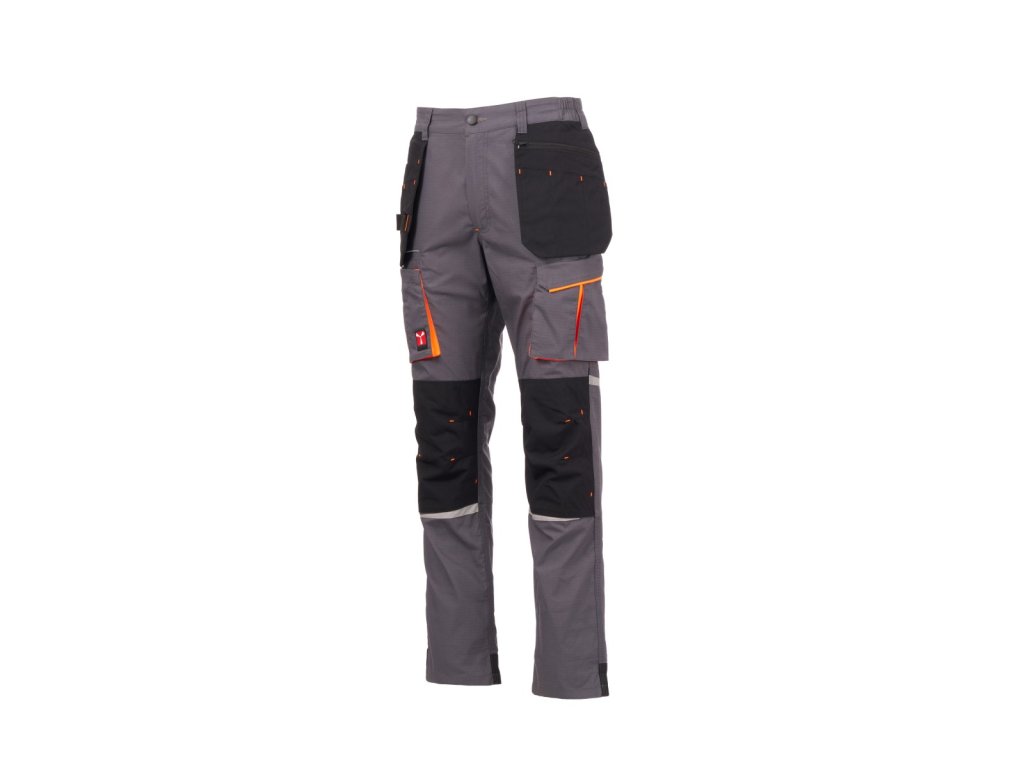 - Na zadní straně je kapsa s klopou na suchý zip (levá nohavice); otevřená kapsa se dvěma reflexními páskami a kapsička na svinovací metr (pravá nohavice)