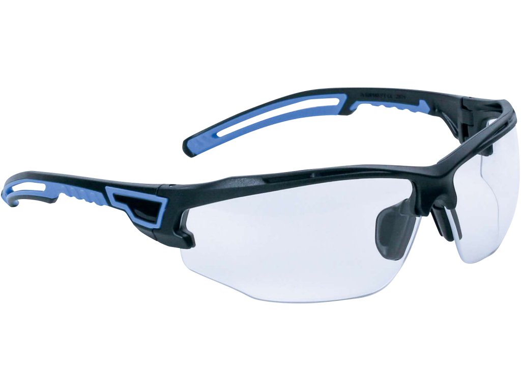 Velmi pohodlné čiré ochranné brýle s nastavitelným nosníkem a stranicemi ze dvou materiálů.