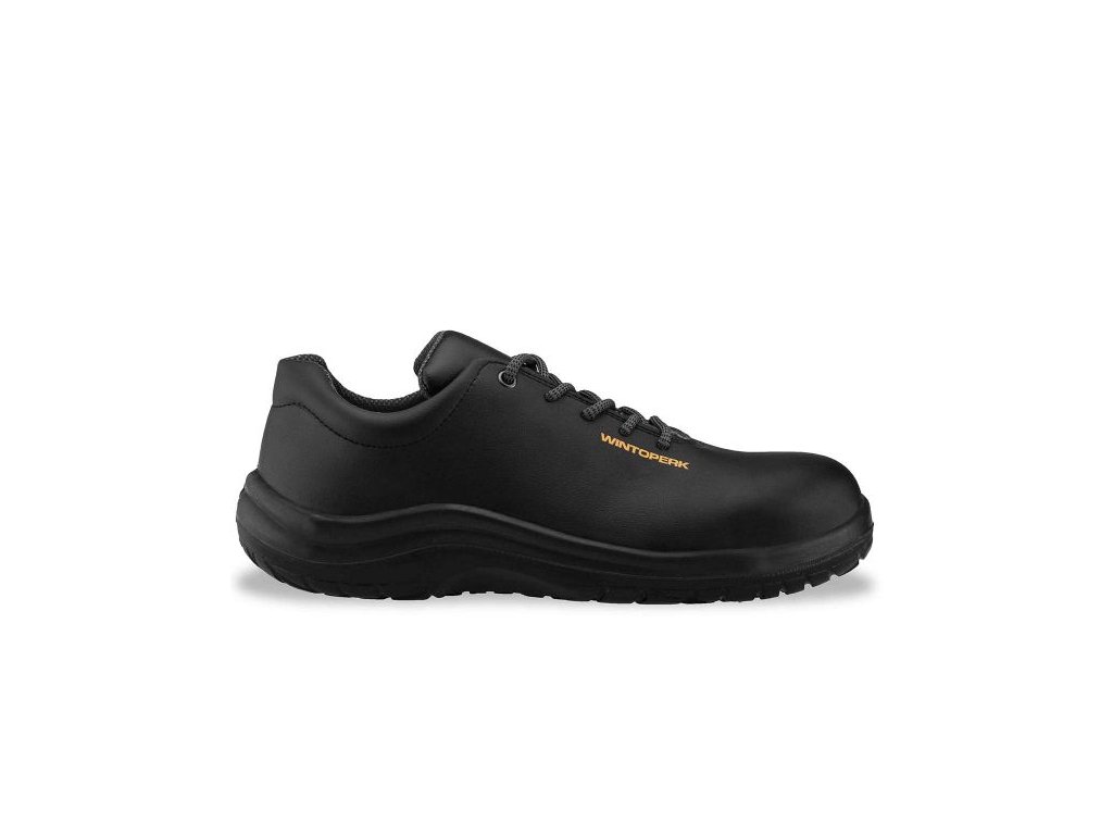 Nízká černá bezpečnostní pracovní obuv na šněrování bez kovových částí s vodě odolnou povrchovou úpravou, nekovová ochranná špička a stélka odolná proti propíchnutí. Protiskluzové vlastnosti SRC.