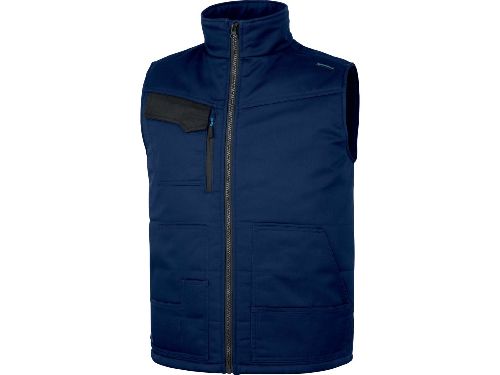 Vesta bez rukávů s 9 kapsami a větruvzdornými průramky kombinující styl a střední hřejivost.